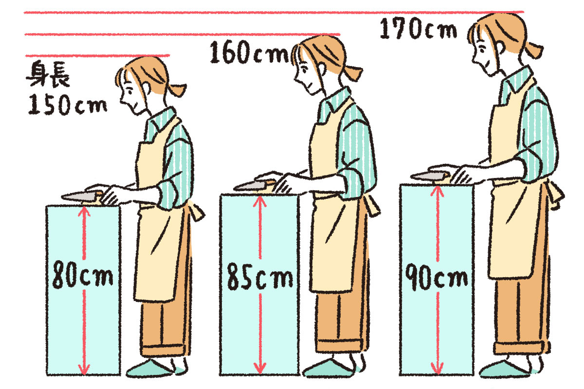 高すぎるキッチン: 包丁で硬いものを切る際に上から力を入れにくく、腕や肩の筋肉を酷使してしまいます。また、コンロの上の鍋の中が見えにくくなるというデメリットも。
