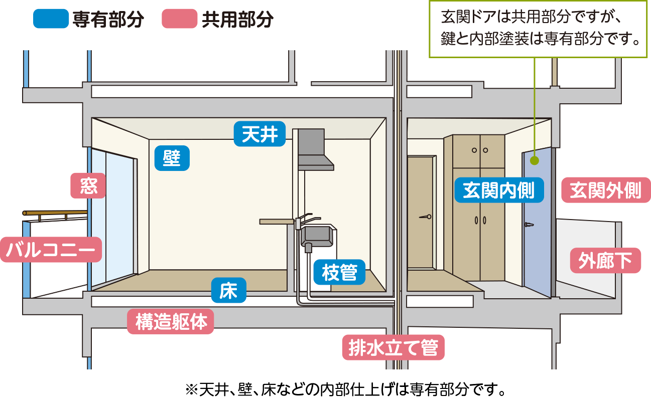 マンションには、個人でリフォームできる「専有部分」と、手を付けてはいけない「共用部分」があります。